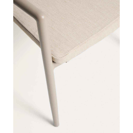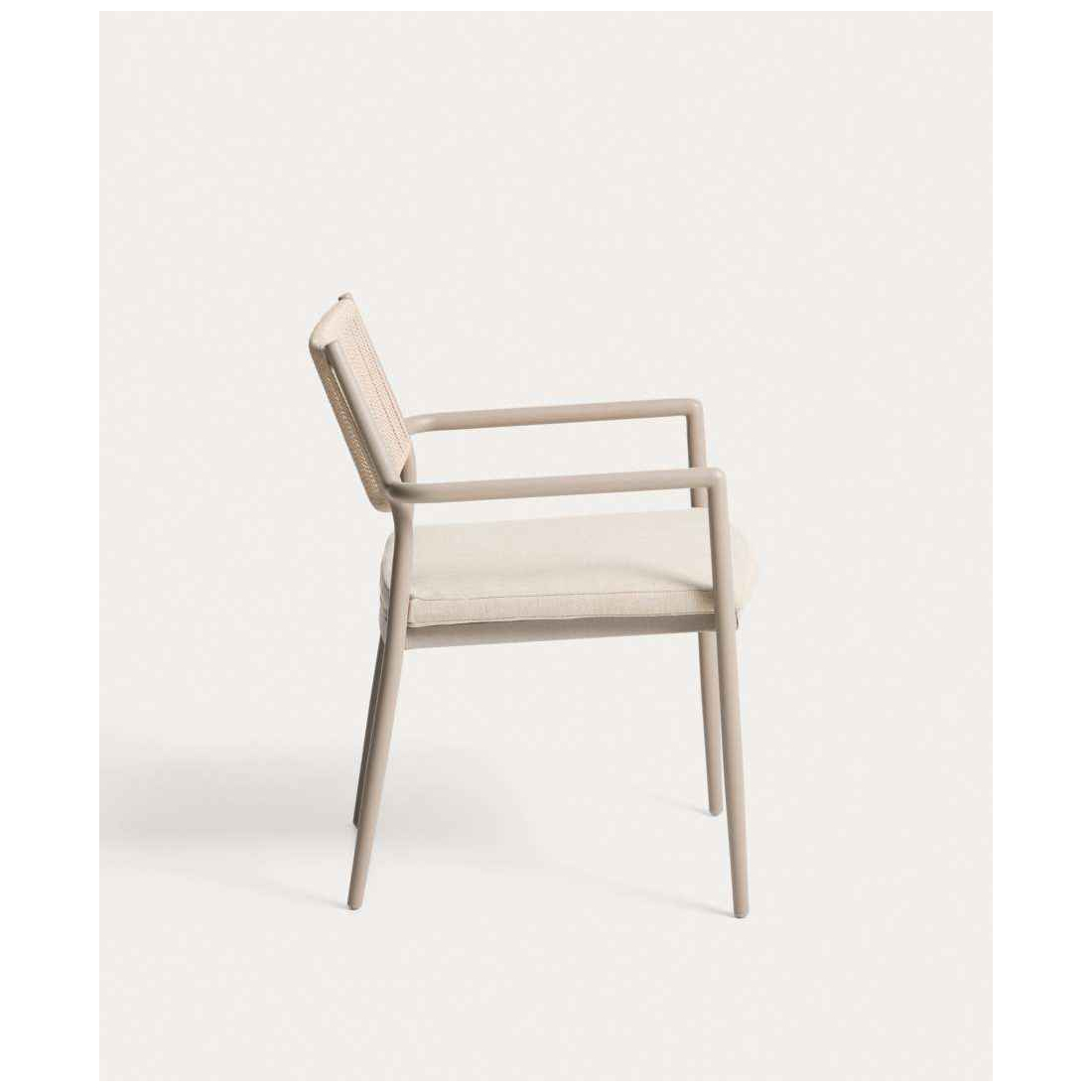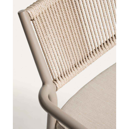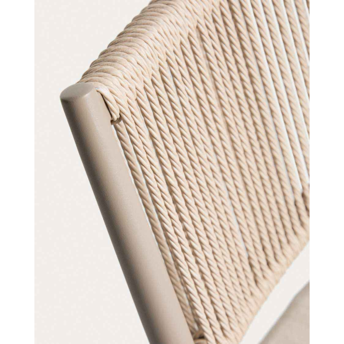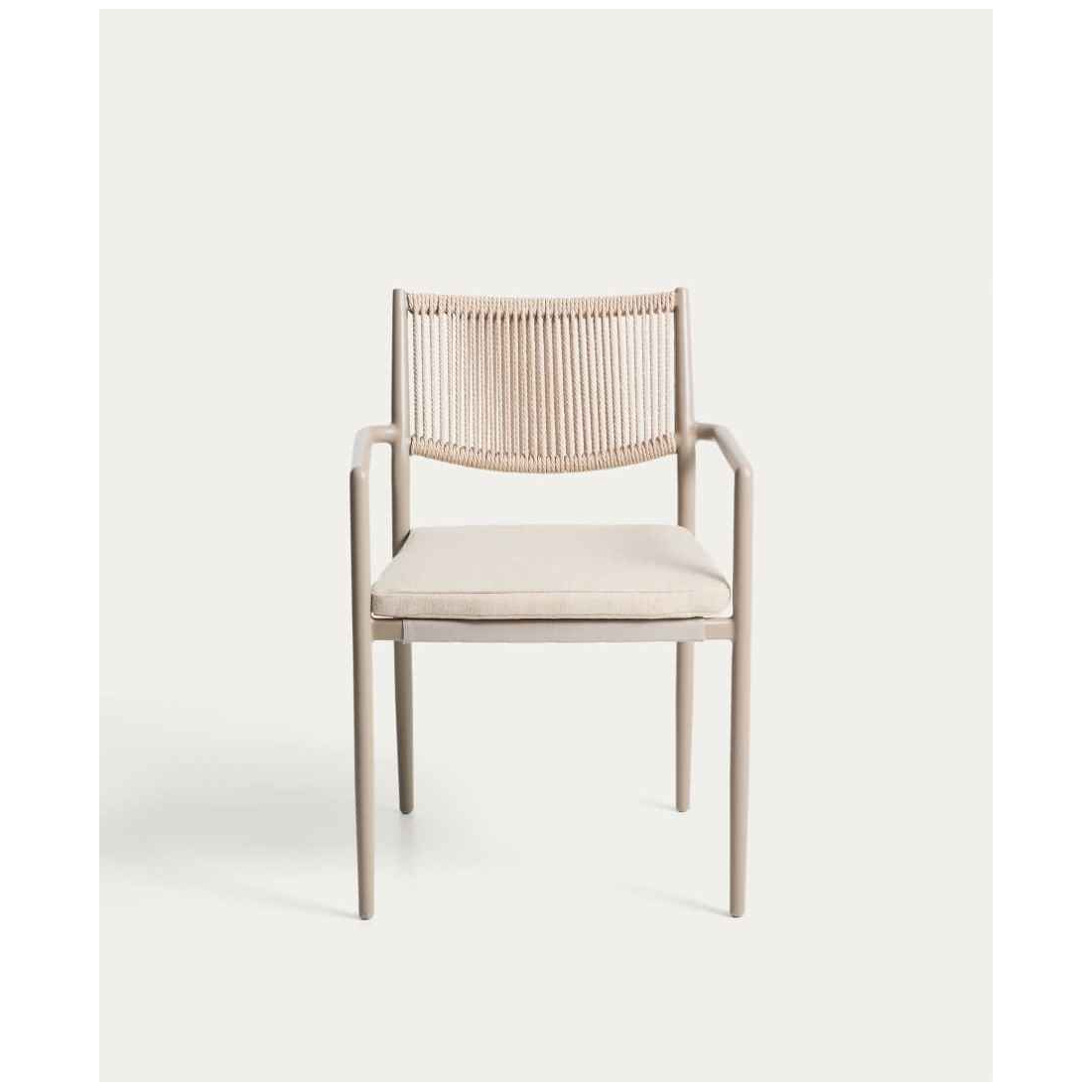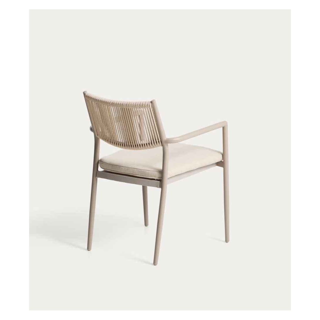 Stohovateľná hliníková stolička ARGASI. Konštrukcia je vyrobená z hliníka, odolného materiálu, ktorý nehrdzavie a odoláva slnečnému žiareniu a vlhkosti. Operadlo je ručne tkané zo syntetického lana. Sedadlo obsahuje vankúš, ktorý zvyšuje pohodlie a dá sa ľahko vybrať na uskladnenie v daždivých dňoch. Argasi je stohovateľná, čo uľahčuje skladovanie bez toho, aby zaberal miesto, a obsahuje chrániče na nohách na ochranu akéhokoľvek typu povrchu. Stolička Argasi kombinuje ľahký dizajn, odolné materiály a decentnú estetiku, ktorá funguje v interiéri aj exteriéri. Vhodná pre vnútorné a kryté vonkajšie použitie.