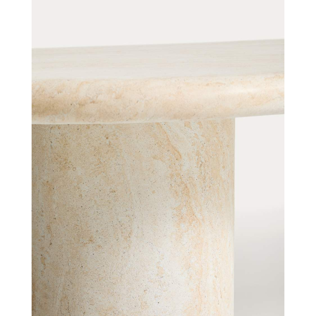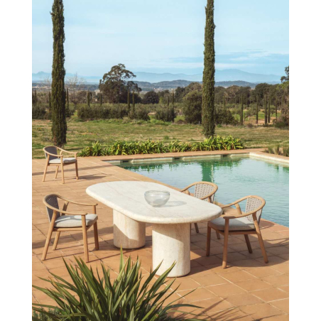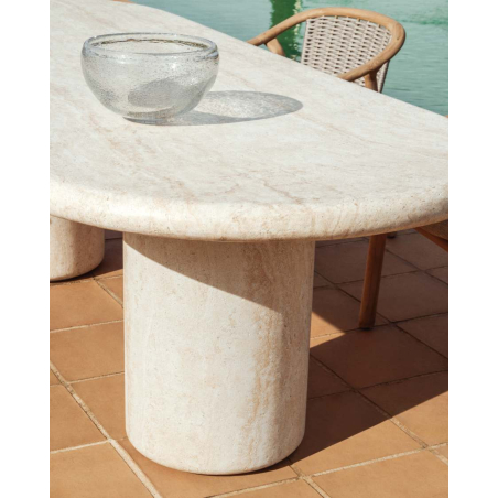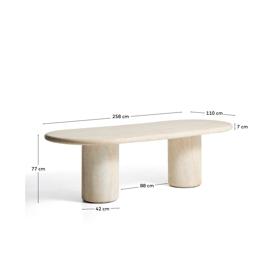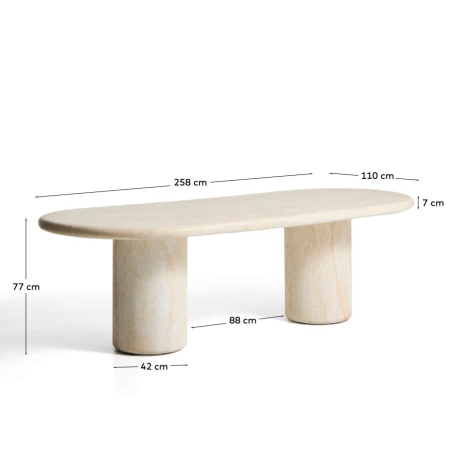 Cementový záhradný stôl DRASI s travertínovým efektom. Z cementovo kompozitného materiálu vystuženého sklenenými vláknami, ktorý poskytuje vysokú odolnosť Každý kus bude exkluzívny, s vlastnými tónmi a textúrami. Vzhľadom na zmeny povahy a teploty môže cement obsahovať mikro-trhlinky a nezrovnalosti, ktoré neovplyvňujú integritu produktu. Dá sa kombinovať so zvyškom kolekcie. Vhodný pre vnútorné a vonkajšie kryté použitie.