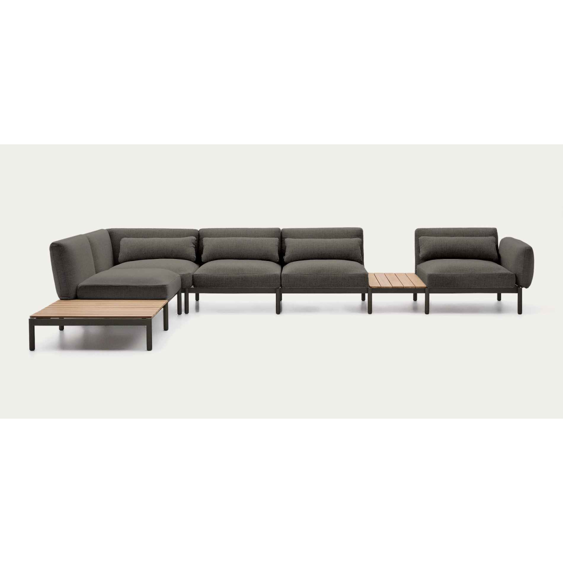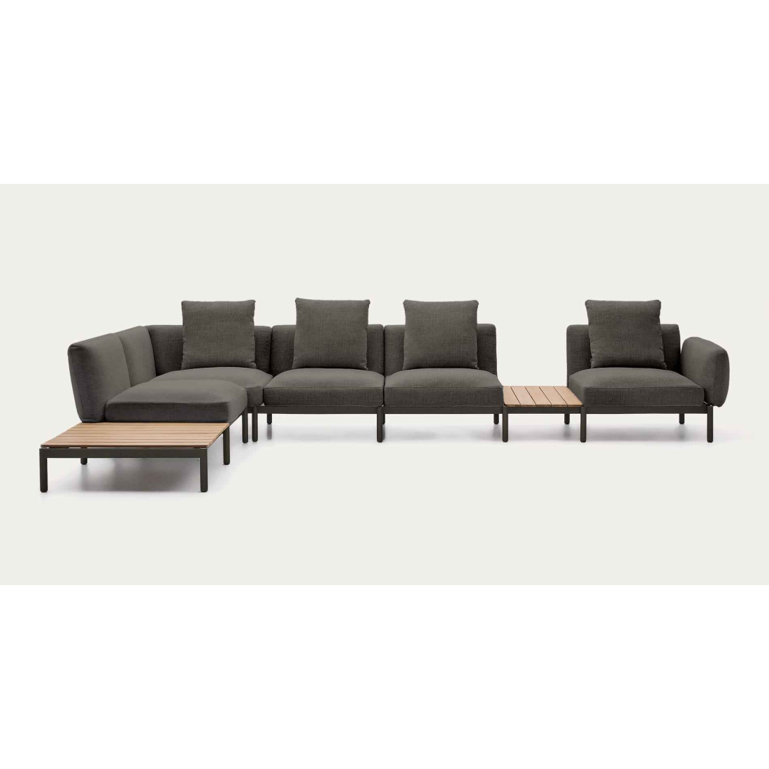 5-miestna modulárna vonkajšia pohovka so stolíkom s čalúnením v béžovej a sivej farbe a sivou alebo zelenou hliníkovou konštrukciou. S integrovaným teakovým lamelovým stolom. Drevo s certifikáciou FSC™ 100% spotrebiteľského reťazca a zodpovedný model obhospodarovania lesov. Konštrukcia odolná voči hrdzi, korózii a UV žiareniu. Teakové drevo odoláva vlhkosti a z nej odvodených mikroorganizmov, je vysoko odolné a trvácne vo vonkajšom prostredí. Ľahký materiál 100% vhodný na vonkajšie použitie. Vhodná do vnútorných a vonkajších priestorov.
