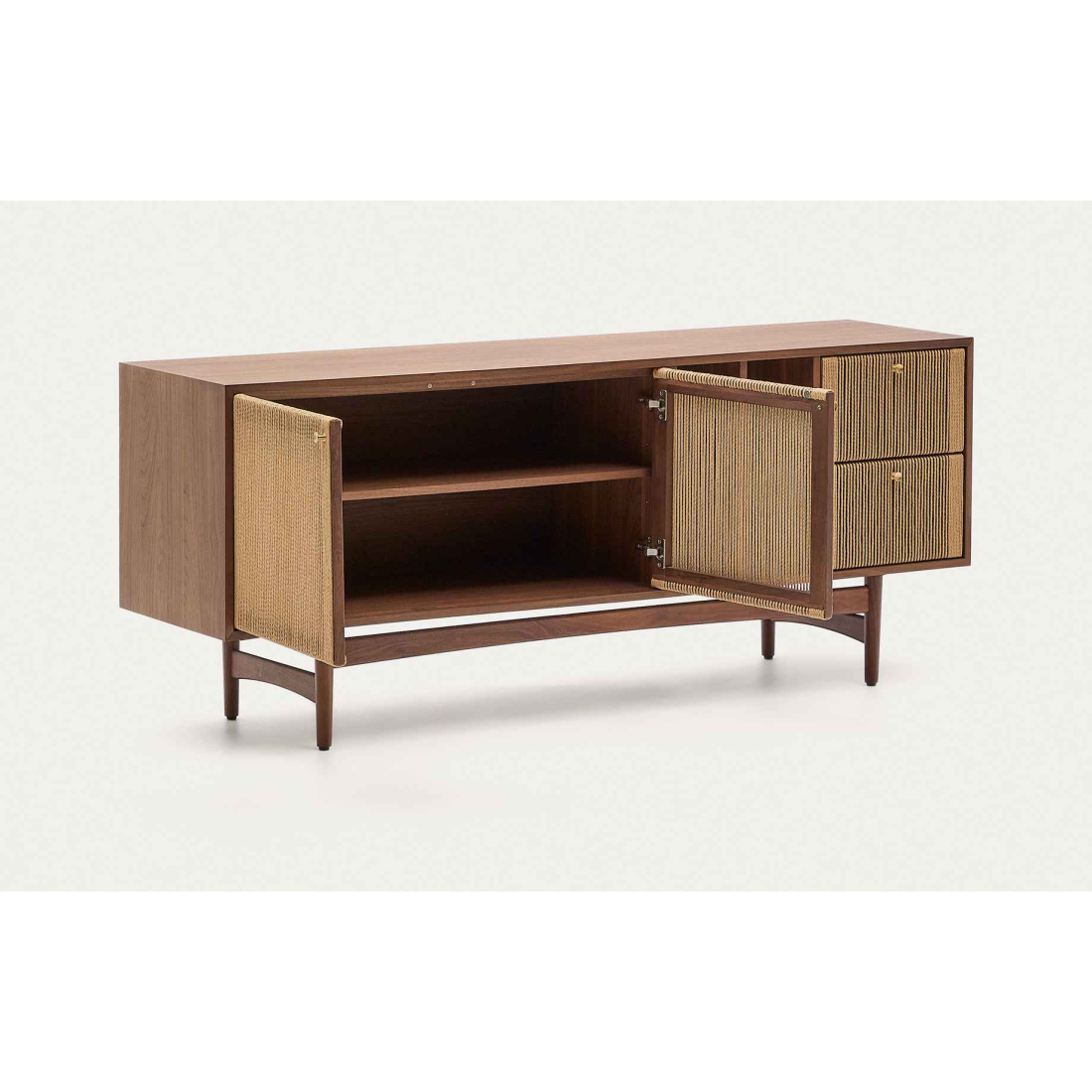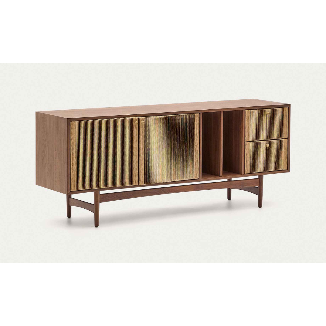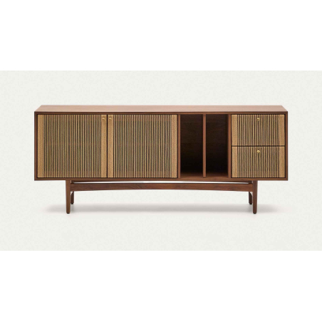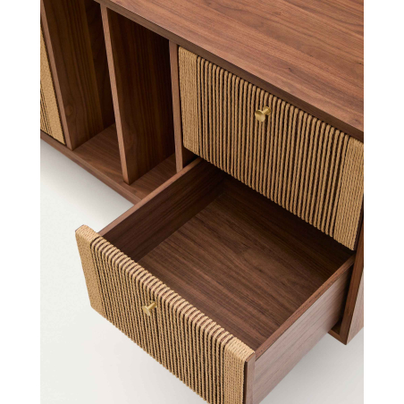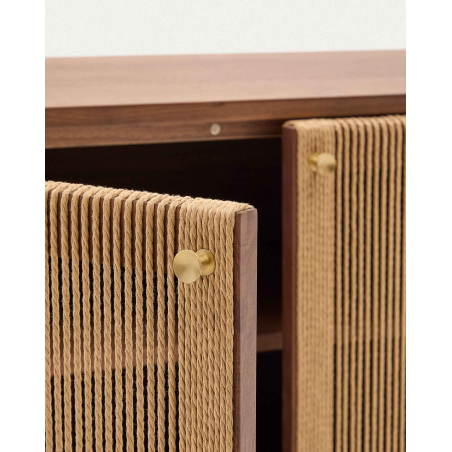 Komoda Elan 2 dvierka a 2 zásuvky dyha, masívny orech a šnúra. Každý kus je nádherne spracovaným umeleckým dielom, kde ručne tkané detaily šnúry dodajú vašim priestorom nádych rustikálnej elegancie. Dvierka s detailom ručne vypletanej papierovej šnúry. Má 3 dvierka s nastaviteľnými pántami, systém tichého zatvárania a mosadzné madlá a 2 zásuvky so skrytými jazdcami a systémom tichého zatvárania. Otvorený úložný priestor s vertikálnym predelom a nastaviteľnými nožičkami.