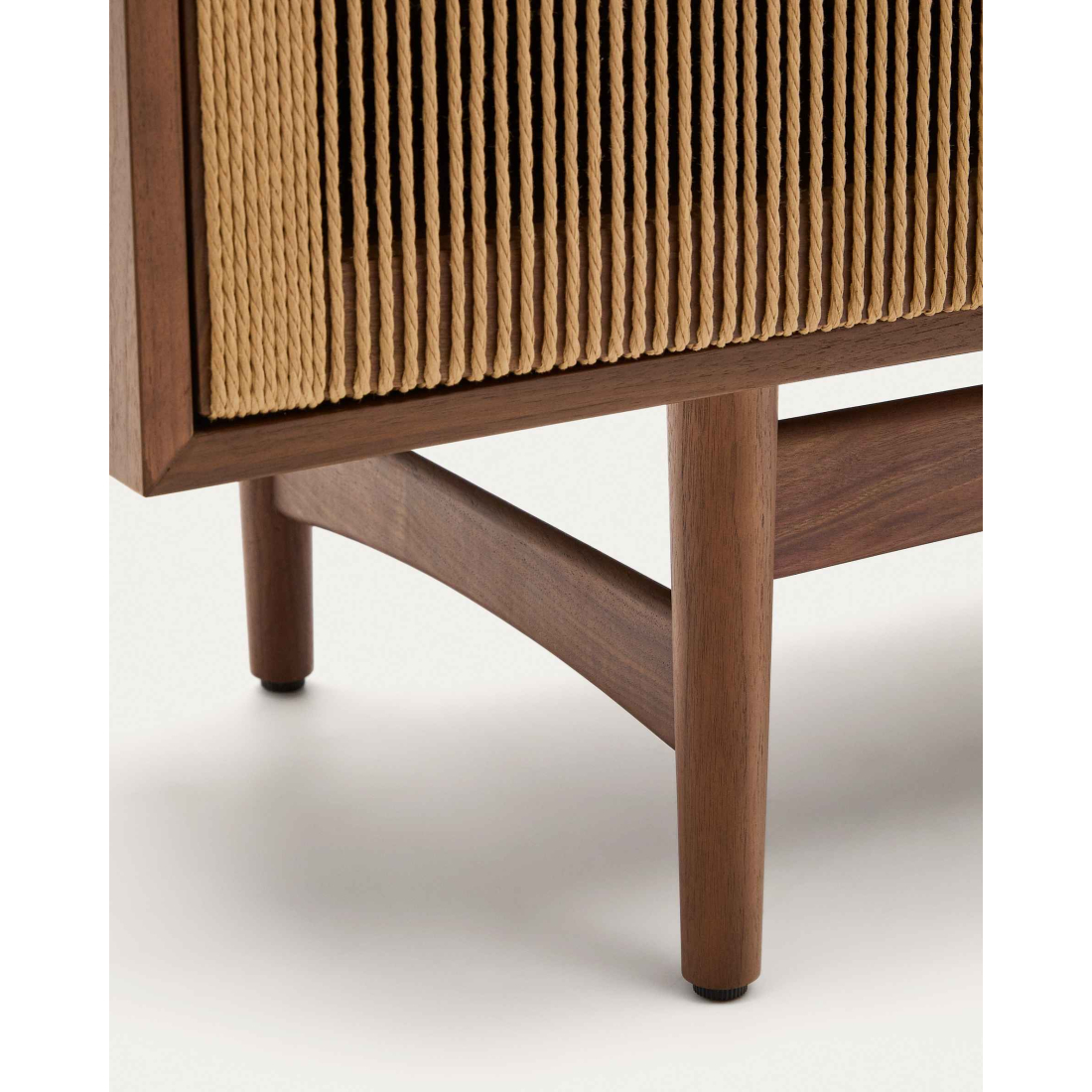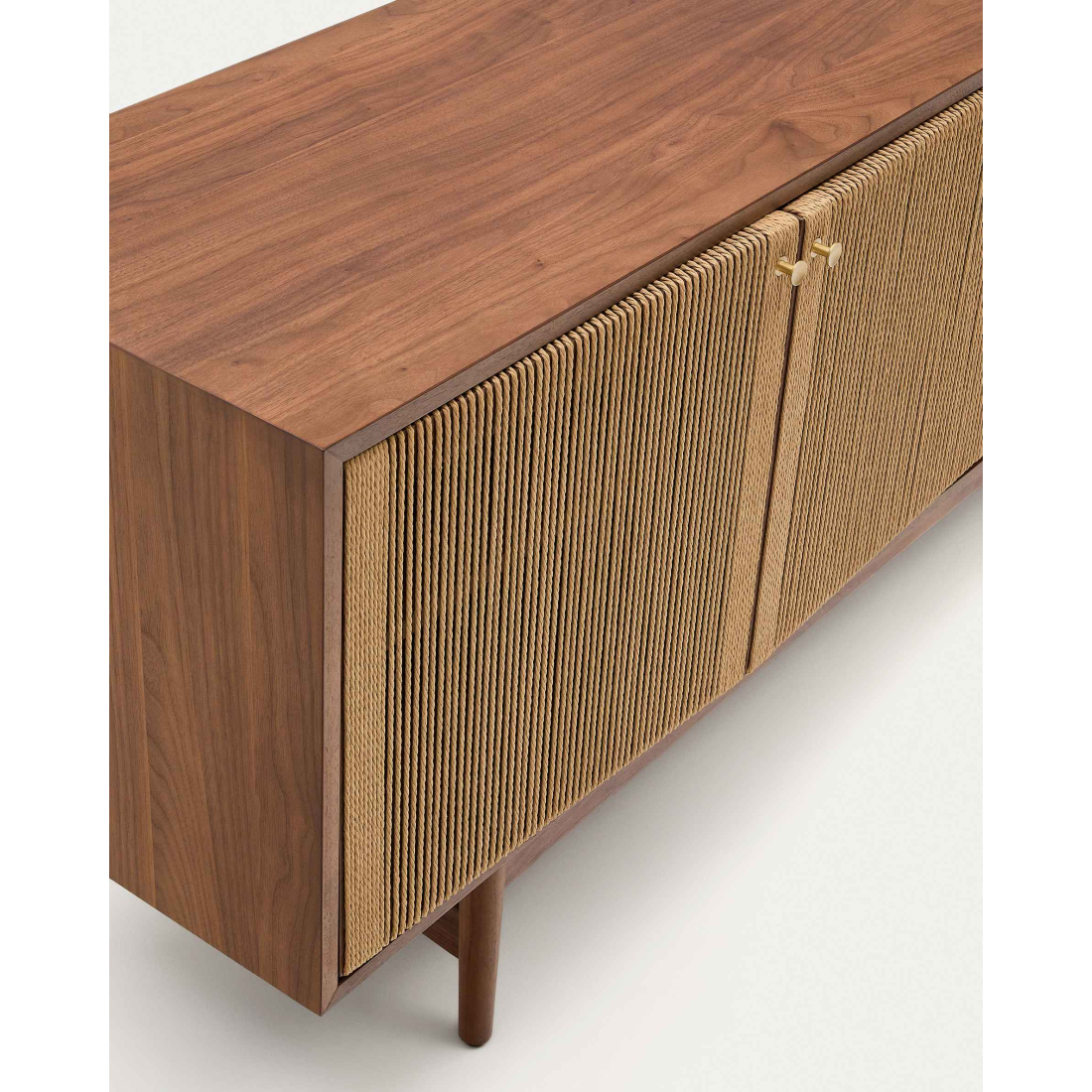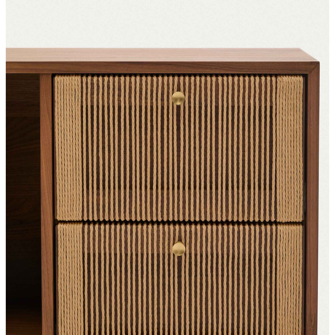 Komoda Elan 2 dvierka a 2 zásuvky dyha, masívny orech a šnúra. Každý kus je nádherne spracovaným umeleckým dielom, kde ručne tkané detaily šnúry dodajú vašim priestorom nádych rustikálnej elegancie. Dvierka s detailom ručne vypletanej papierovej šnúry. Má 3 dvierka s nastaviteľnými pántami, systém tichého zatvárania a mosadzné madlá a 2 zásuvky so skrytými jazdcami a systémom tichého zatvárania. Otvorený úložný priestor s vertikálnym predelom a nastaviteľnými nožičkami.