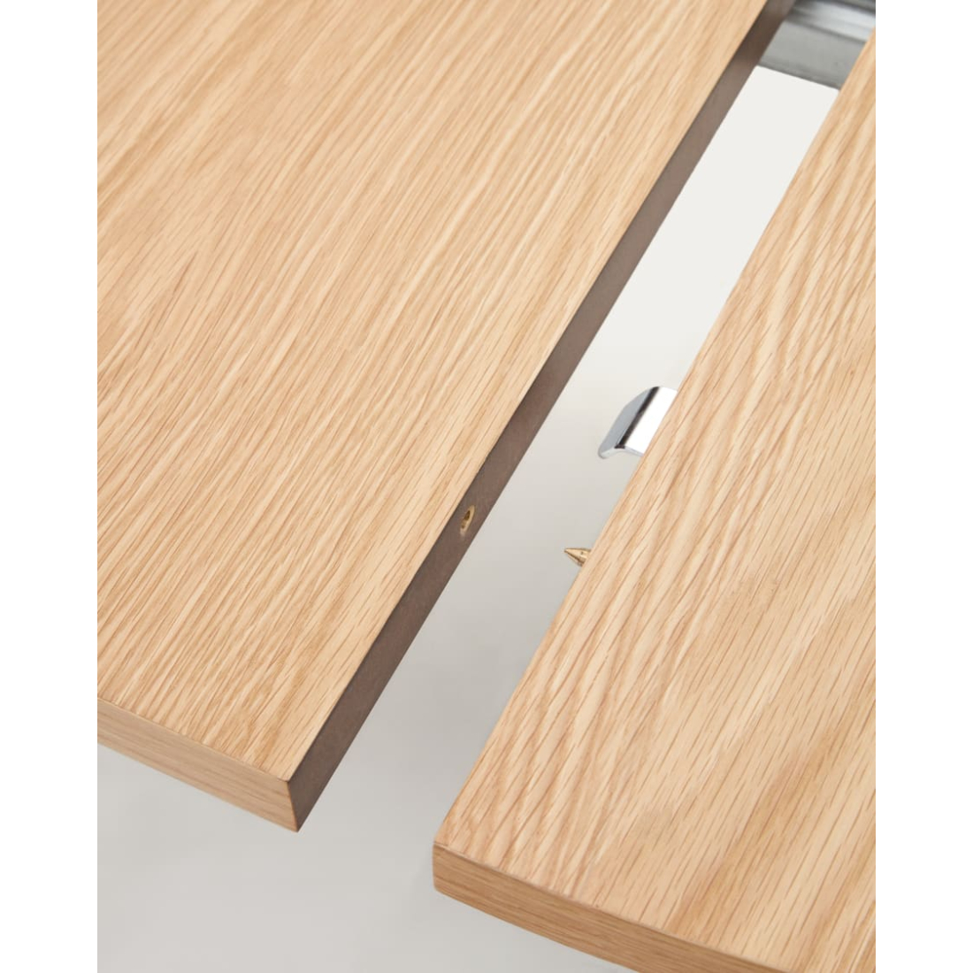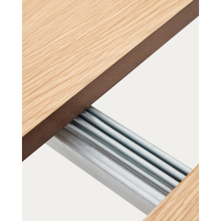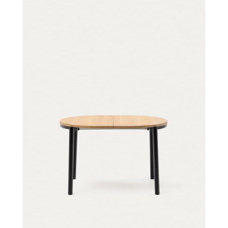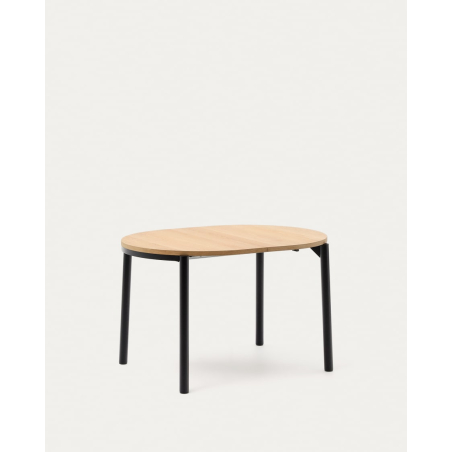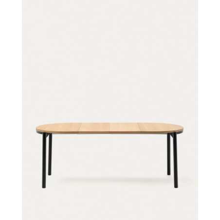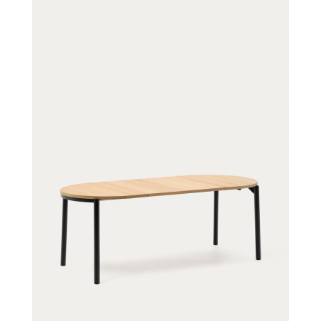 Rozťahovací oválny stôl Montuiri z dubovej dyhy s oceľovými nohami s čiernou povrchovou úpravou. Využite priestor vo svojej jedálni s rozťahovacím stolom Montuiri, ktorý je ideálny na výber veľkosti, ktorú potrebujete pri akejkoľvek príležitosti. Obsahuje dva 40 cm nadstavce, ktoré sa skladujú mimo stola.