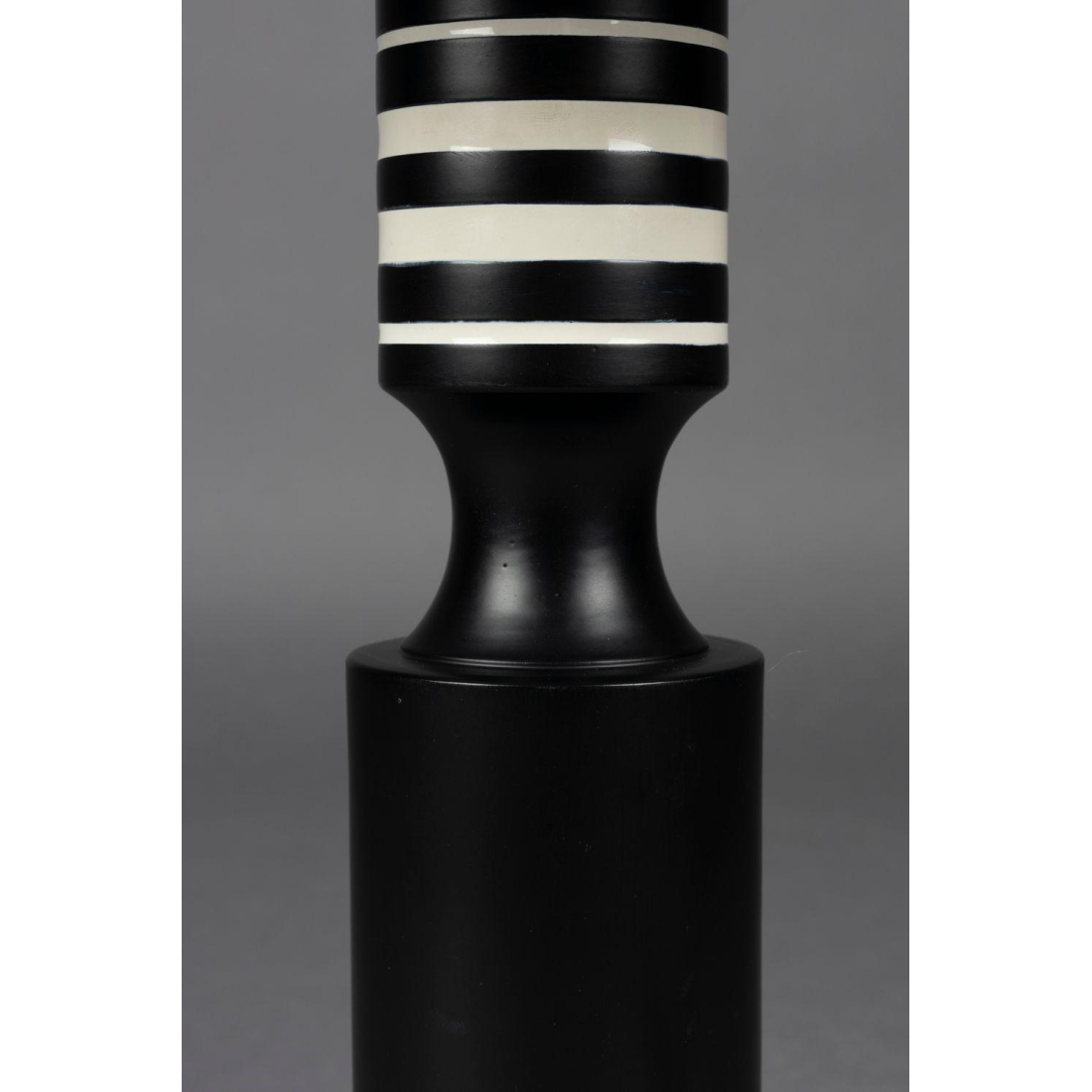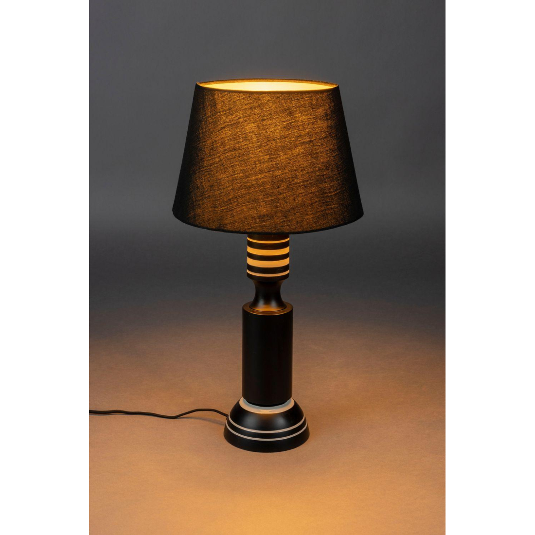 Čierna stolová lampa s výrazným vintage vzhľadom. Má štýl 50. rokov. Lesklé biele pruhy na matnom čiernom podklade a rozdiely v hrúbkach vytvárajú hravý efekt. V kombinácii s ľanovým tienidlom vytvára výrazný vzhľad, ktorý naplní miestnosť príjemnou atmosférou vo dne aj v noci. Vyrobené zo železa. Vypínač má kábli. Kompatibilné so žiarovkami E27 max. 2 W, nie je súčasťou balenia.